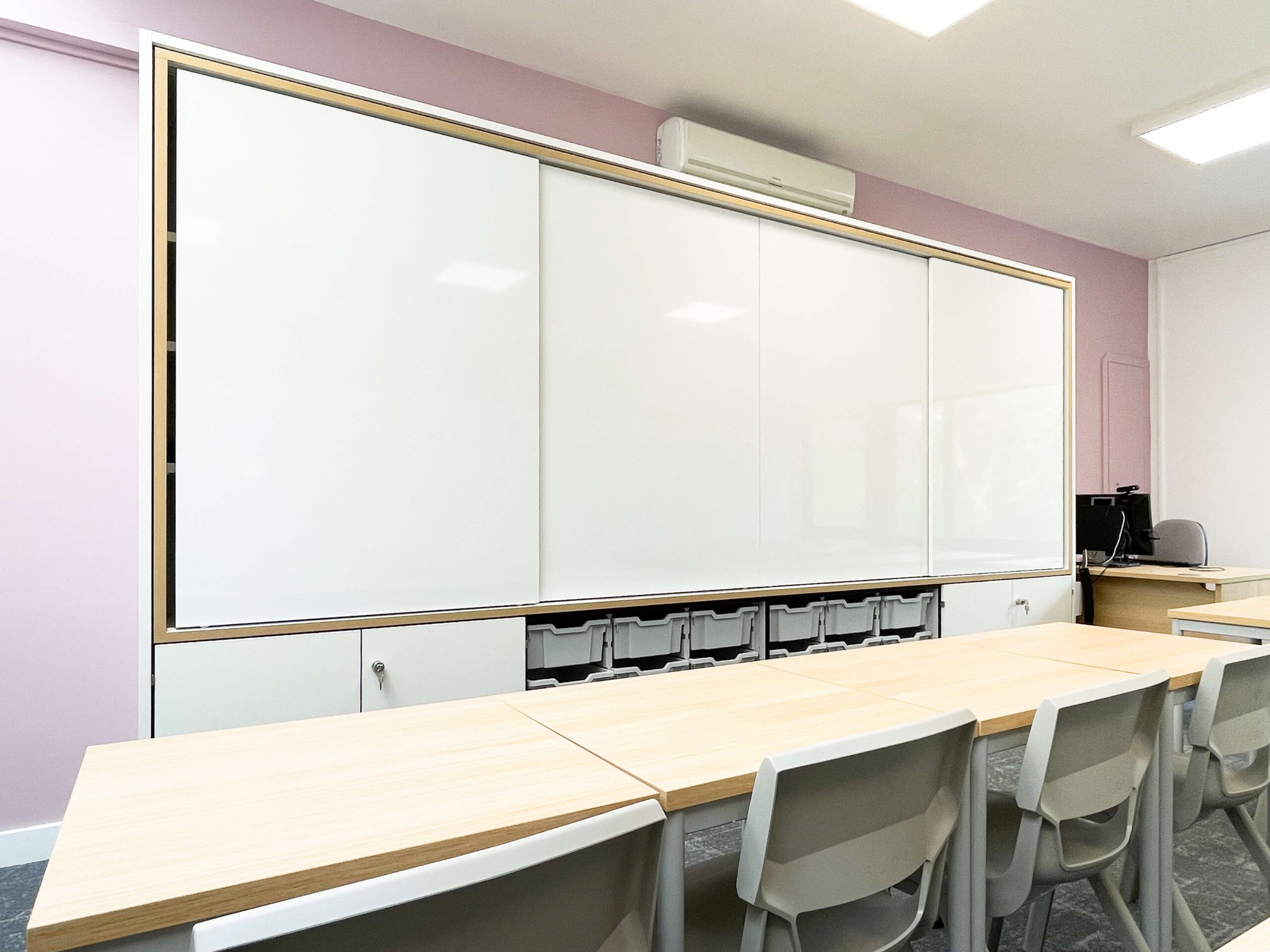 At Flexible Office Furniture & Interiors, we don’t just work with office spaces, but also have extensive experience working in the education sector. Our Teaching walls can be created with adjustable shelving, secure cupboards, and integrated cable management, enhancing your classroom’s functionality and aesthetics.